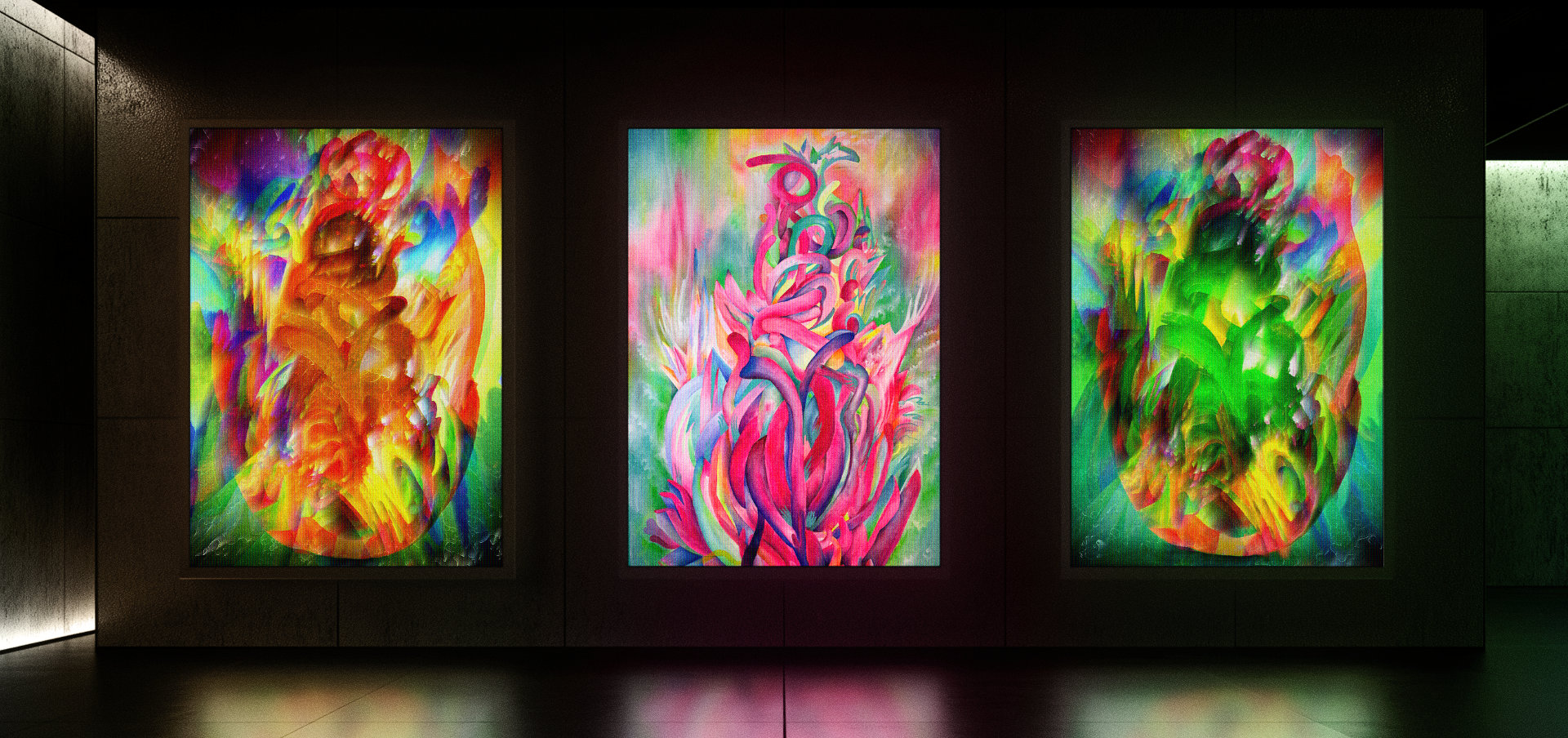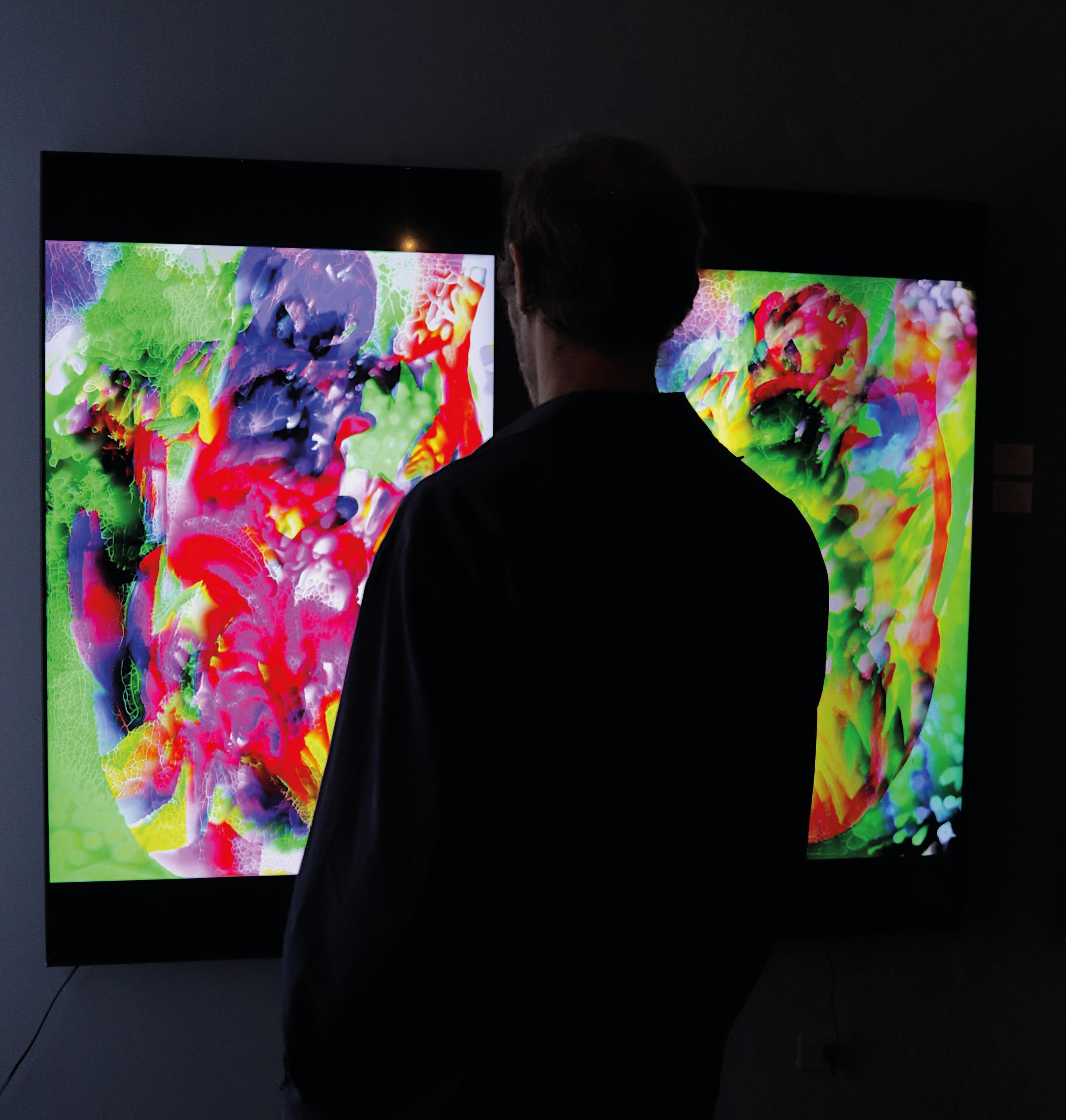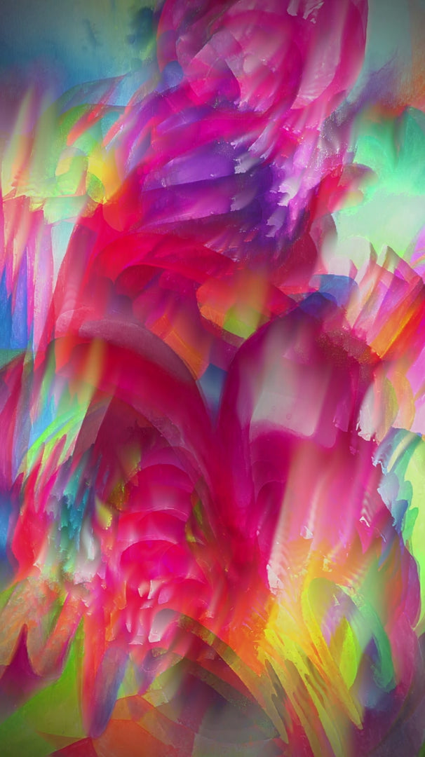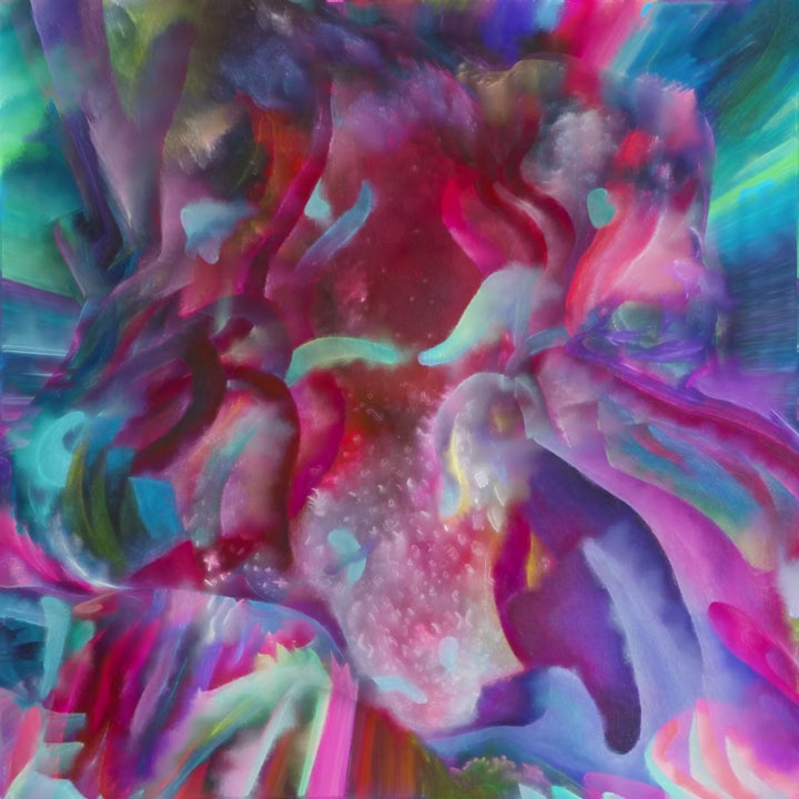 Desde aquí puedes ver las estrellas es una pintura acrílica sobre lienzo que se expande al formato digital mediante un proceso que no utiliza inteligencia artificial. A través de software, la obra se desarrolla como un collage digital animado que sigue las teorías de la pintura expandida, entendiendo que la pintura puede existir en otras materialidades y formalidades, desplazándose más allá del espacio tridimensional objetual.
