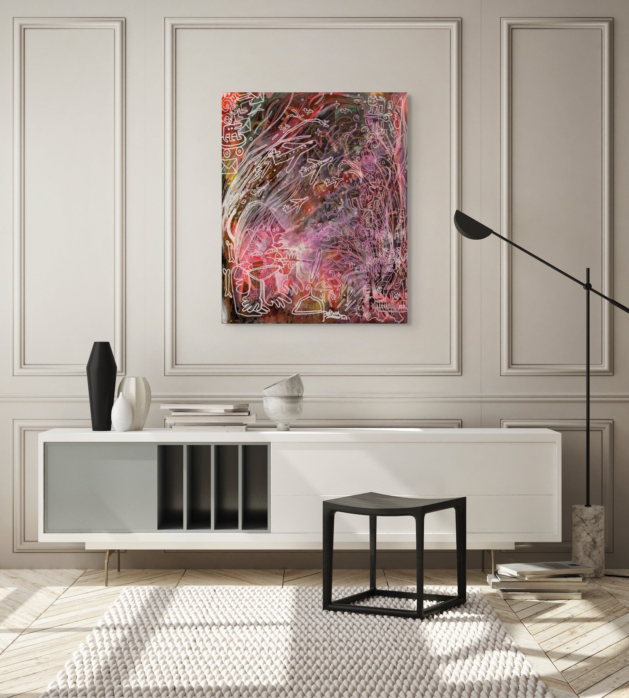 博斯米的绘画占据着有限却又半开放的空间。或许,它的独特性,以及它有时展现出的自主性,既源于他作品的叙事性,也源于他技法的独特性。这位艺术家创造了虚构的空间,介于梦幻般的具象、精心设计的论述和不受约束的虚构之间。它们是风景或维度,除了自身的形态和色彩之外,没有任何其他参照物。一方面,这些空间——有时带有反乌托邦色彩——被抽象的符号或清晰的具象形式所占据或穿行,彼此分离,脱离任何支撑(变异的动物、人形轮廓和残缺的物体)。它们是轮廓模糊的存在,是不完整的有机体或正在形成中的有机体,或许是幽灵般的符号:环境、人类主体性和世界数字化之间的秘密通道产生了中间阶段,产生了过渡中身体的草图。另一方面,作品中涌动的抽象笔触旨在成为书写的一部分;它们是后语言的信件或这些符号,是未知语言的语句片段或图形,却拥有与色彩、纹理或形式相同的表现价值。绘画本身必须以博斯米作品中那场伟大的过渡仪式为切入点来理解:它超越了平面和物体的范畴,进入了由虚拟性支配的非现实领域,却又不放弃其绘画的本质。(……)